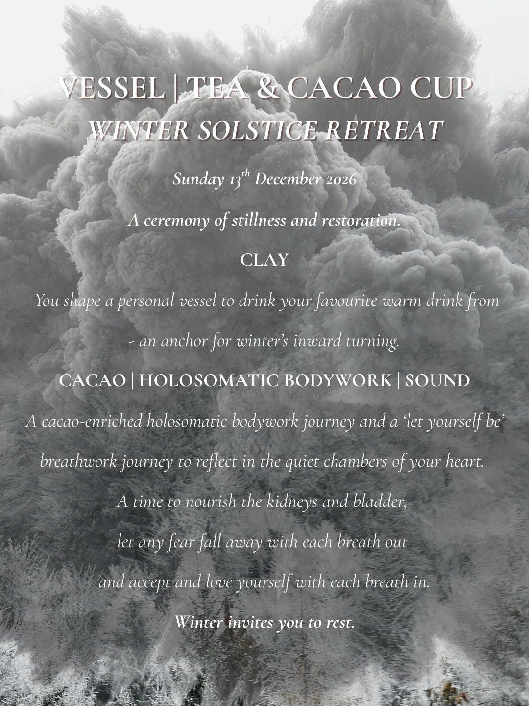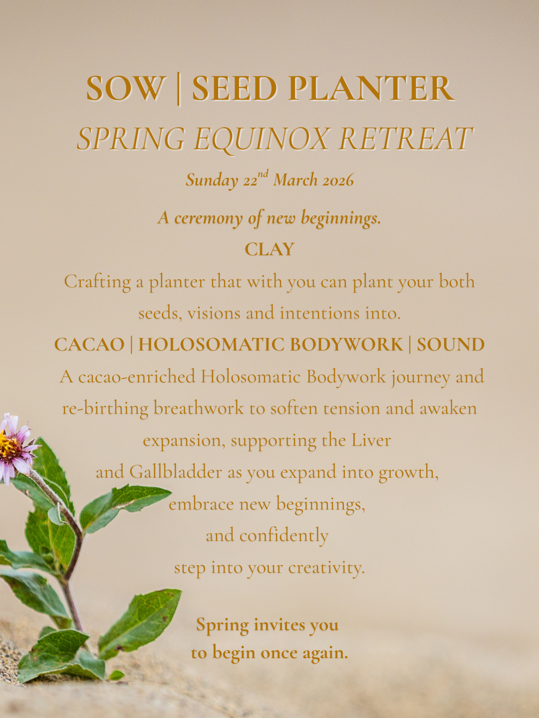 Clay, cacao, and holosomatic bodywork, conscious connected breathwork and a soundscape journey to guide you into alignment with the natural rhythms of the year.